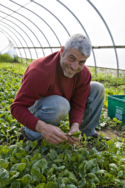 Rodrigo Venturelli harvests the early spring spinach at Plan B Organic Farms in Ontario, Canada.